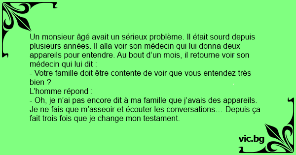 Un monsieur âgé avait un sérieux problème. Il était sourd depuis plusieurs années. Il alla voir son médecin qui lui donna deux appareils pour entendre. Au bout d’un mois, il retourne voir son médecin qui lui dit :