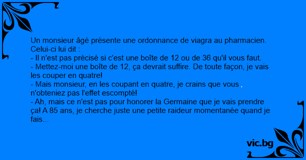 Un monsieur âgé présente une ordonnance de viаgrа au pharmacien. Celui-ci lui dit :