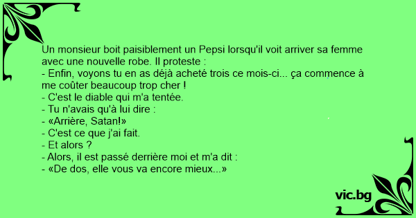 Un monsieur boit paisiblement un Pepsi lorsqu'il voit arriver sa femme avec une nouvelle robe. Il proteste :