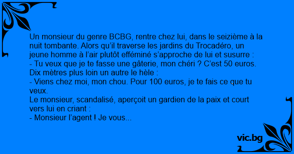 Un monsieur du genre BCBG, rentre chez lui, dans le seizième à la nuit tombante. Alors qu’il traverse les jardins du Trocadéro, un jeune homme à l’air plutôt efféminé s’approche de lui et susurre :
