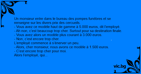 Un monsieur entre dans le bureau des pompes funèbres et se renseigne sur les divers prix des cercueils.