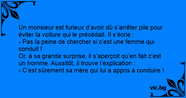 Un monsieur est furieux d’avoir dû s’arrêter pile pour éviter la voiture qui le précédait. Il s’écrie :