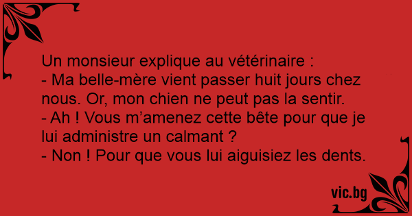 - Ma belle-mère vient passer huit jours chez nous. Or, mon chien ne peut pas la sentir.