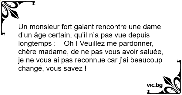 Un monsieur fort galant rencontre une dame d’un âge certain, qu’il n’a pas vue depuis longtemps : – Oh ! Veuillez me pardonner, chère madame, de ne pas vous avoir saluée, je ne vous ai pas reconnue car j’ai beaucoup changé, vous savez !