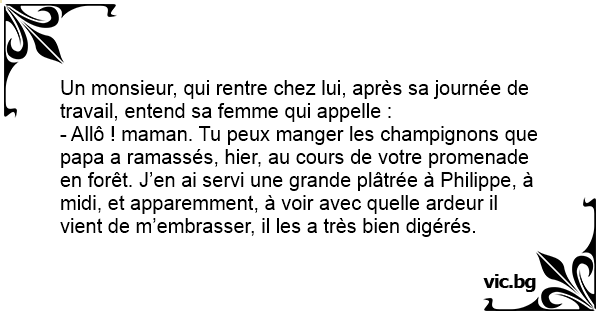 - Allô ! maman. Tu peux manger les champignons que papa a ramassés, hier, au cours de votre promenade en forêt. J’en ai servi une grande plâtrée à Philippe, à midi, et apparemment, à voir avec quelle ardeur il vient de m’embrasser, il les a très bien digérés.