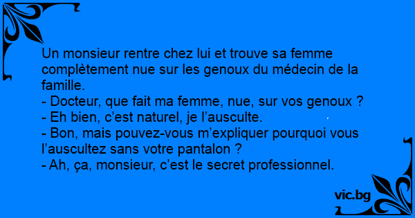 Un monsieur rentre chez lui et trouve sa femme complètement nue sur les genoux du médecin de la famille.