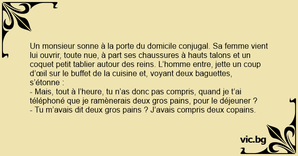 Un monsieur sonne à la porte du domicile conjugal. Sa femme vient lui ouvrir, toute nue, à part ses chaussures à hauts talons et un coquet petit tablier autour des reins. L’homme entre, jette un coup d’œil sur le buffet de la cuisine et, voyant deux baguettes, s’étonne :