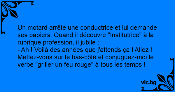 Un motard arrête une conductrice et lui demande ses papiers. Quand il découvre "Institutrice" à la rubrique profession, il jubile :