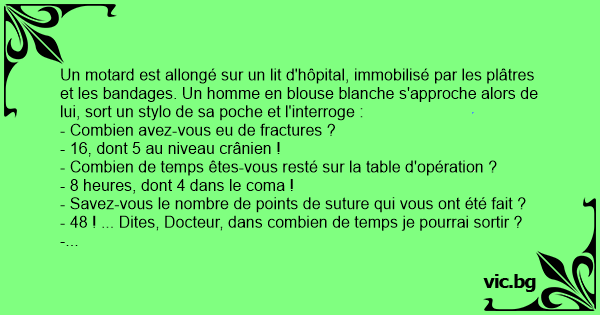 Un motard est allongé sur un lit d'hôpital, immobilisé par les plâtres et les bandages. Un homme en blouse blanche s'approche alors de lui, sort un stylo de sa poche et l'interroge :