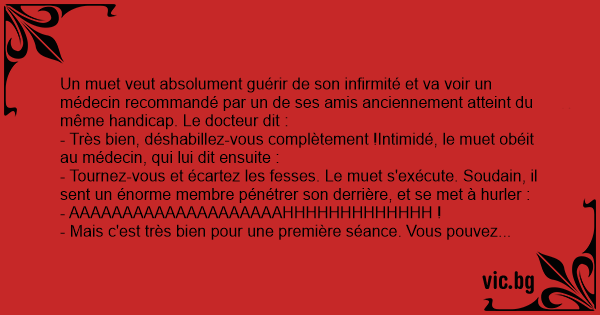 - Très bien, déshabillez-vous complètement !Intimidé, le muet obéit au médecin, qui lui dit ensuite :