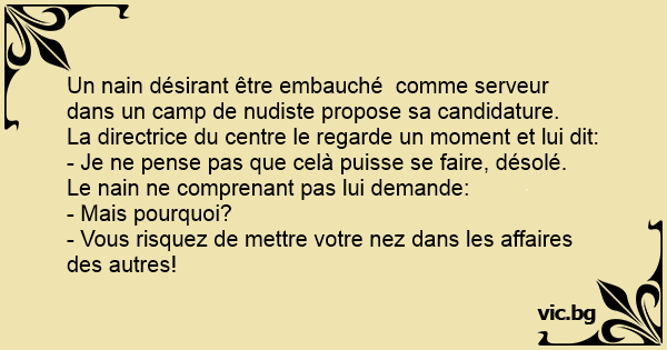 Un nain désirant être embauché comme serveur dans un camp de nudiste propose sa candidature.