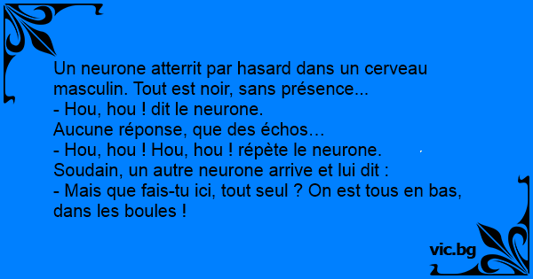 En kvinnlig hjärncell kom fel och kom in i en mans hjärna. Det var alldeles tomt och mörkt där inne. - Hallå? ropade hon men fick inget svar. Hon gick längre in i hjärnan. - Hallå? Hon fick fortfarande inget svar. Då bestämde hon sig för att gå så...
