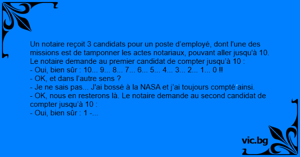 Un notaire reçoit 3 candidats pour un poste d’employé, dont l'une des missions est de tamponner les actes notariaux, pouvant aller jusqu'à 10. Le notaire demande au premier candidat de compter jusqu’à 10 :