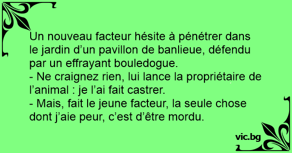 - Mais, fait le jeune facteur, la seule chose dont j’aie peur, c’est d’être mordu.