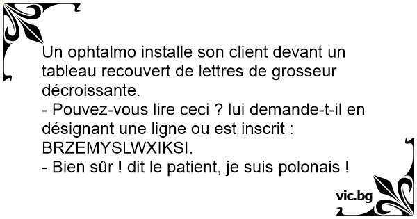 A Polish man goes to the eye doctor... A Polish man goes to the eye doctor. The bottom line of the eye chart has the letters: C z y n q s t a s z The Optometrist asks „Can you read this?” „Read...