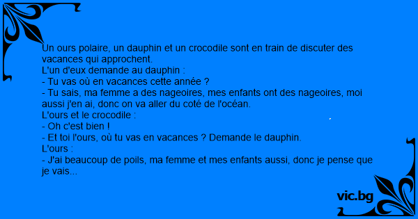 - Et toi l'ours, où tu vas en vacances ? Demande le dauphin.