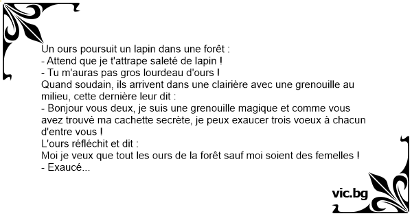 Ein Bär jagt gerade einen Hasen durch den Wald, als sie einem Frosch begegnen. "Ich bin ein Feen-Frosch und ihr habt nun beide 3 Wünsche frei", meinte der Frosch. Bär, Du darfst beginnen!" Der Bär überlegte lang und da er ein Macho-Bär ist, wünschte er sich: "Ich wünsche mir, dass alle Bären...