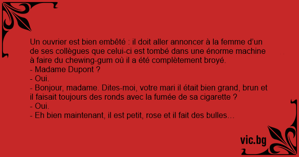 Un ouvrier est bien embêté : il doit aller annoncer à la femme d’un de ses collègues que celui-ci est tombé dans une énorme machine à faire du chewing-gum où il a été complètement broyé.