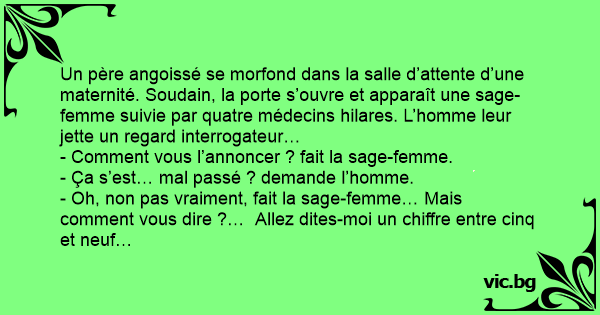- Oh, non pas vraiment, fait la sage-femme… Mais comment vous dire ?… Allez dites-moi un chiffre entre cinq et neuf…