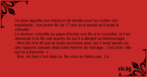 Un père appelle son médecin de famille pour lui confier son inquiétude : son jeune fils de 17 ans lui a avoué qu'il avait la chtouille.