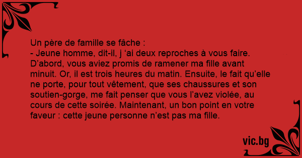 - Jeune homme, dit-il, j ‘ai deux reproches à vous faire. D’abord, vous aviez promis de ramener ma fille avant minuit. Or, il est trois heures du matin. Ensuite, le fait qu’elle ne porte, pour tout vêtement, que ses chaussures et son soutien-gorge, me fait penser que vous l’avez violée, au cours de cette soirée. Maintenant, un bon point en votre faveur : cette jeune personne n’est pas ma fille.