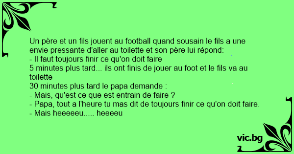 Un père et un fils jouent au football quand sousain le fils a une envie pressante d'aller au toilette et son père lui répond: