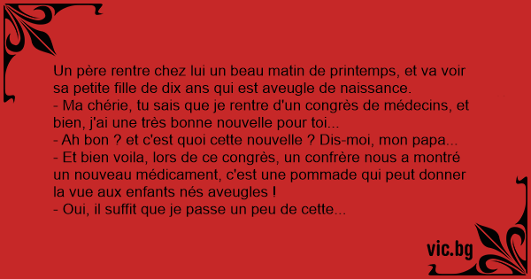 - Et bien voila, lors de ce congrès, un confrère nous a montré un nouveau médicament, c'est une pommade qui peut donner la vue aux enfants nés aveugles !