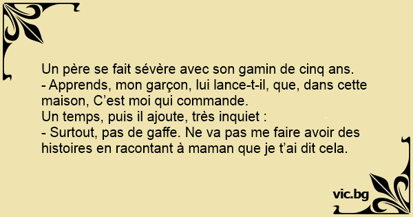- Apprends, mon garçon, lui lance-t-il, que, dans cette maison, C’est moi qui commande.