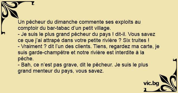 - Bah, ce n’est pas grave, dit le pêcheur. Je suis le plus grand menteur du pays, vous savez.