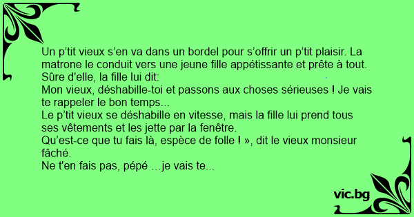 Un p’тiт vieux s’en va dans un bordel pour s’offrir un p’тiт plaisir. La matrone le conduit vers une jeune fille appétissante et prête à tout. Sûre d'elle, la fille lui dit: