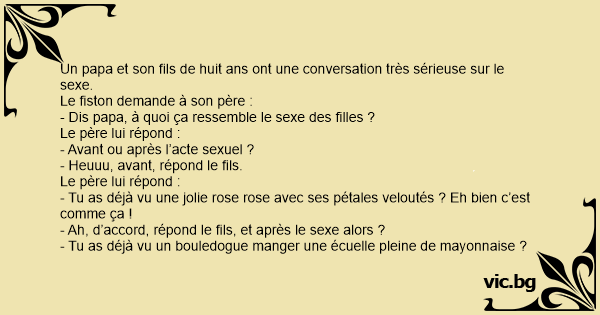 - Ah, d’accord, répond le fils, et après le sexe alors ?