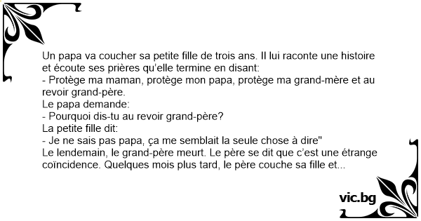 Le lendemain, le grand-père meurt. Le père se dit que c’est une étrange coïncidence. Quelques mois plus таrd, le père couche sa fille et écoute ses prières qui se terminent par: