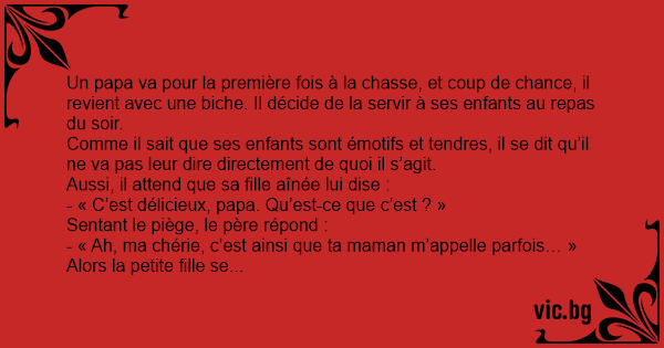 Un papa va pour la première fois à la chasse, et coup de chance, il revient avec une biche. Il décide de la servir à ses enfants au repas du soir.