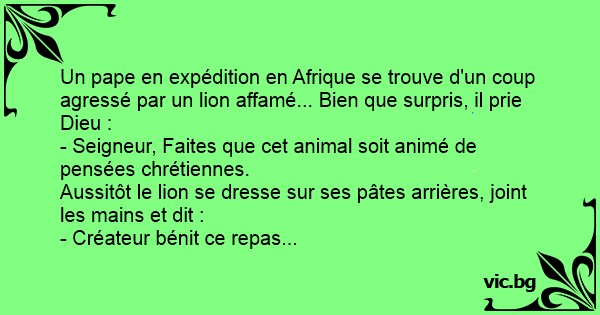 Il était une fois un explorateur qui tomba devant un lion. L'explorateur apeuré dit : - Dieu, faites que ce lion est une pensée Chrétienne. Et le lion répondis : - Dieu, bénissez ce repas.