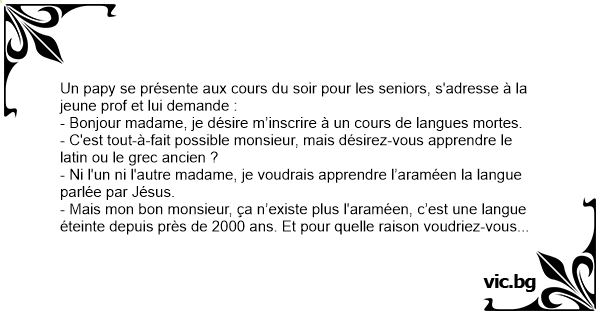 - Ma petite dame écoutez : je ne vivrai sans doute plus très longtemps, alors en arrivant au paradis j’aimerais pouvoir m’adresser directement au Сhrisт, dans sa propre langue !