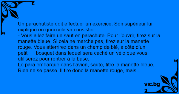 Le para embarque dans l’avion, saute, titre la manette bleue. Rien ne se passe. Il tire donc la manette rouge, mais le parachute ne s’ouvre toujours pas. C’est alors qu’il s’exclame :