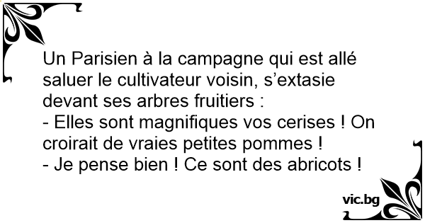 Un Parisien à la campagne qui est allé saluer le cultivateur voisin, s’extasie devant ses arbres fruitiers :