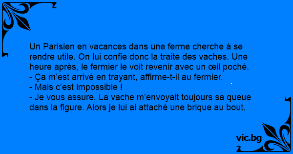 - Je vous assure. La vache m’envoyait toujours sa queue dans la figure. Alors je lui ai attaché une brique au bout.