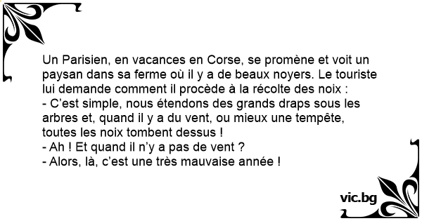 Un Parisien, en vacances en Corse, se promène et voit un paysan dans sa ferme où il y a de beaux noyers. Le touriste lui demande comment il procède à la récolte des noix :