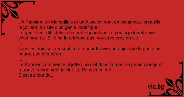 Un Parisien, un Marseillais et un Alsacien sont en vacances, lorsqu'ils reçoivent la visite d'un génie maléfique !