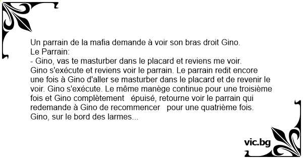 Gino s'exécute et reviens voir le parrain. Le parrain redit encore une fois à Gino d'aller se masturber dans le placard et de revenir le voir. Gino s'exécute. Le même manège continue pour une troisième fois et Gino complètement épuisé, retourne voir le parrain qui redemande à Gino de recommencer pour une quatrième fois.