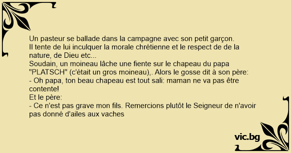 Un père parle religion avec son fils : - Vois tu, mon enfant, dans la vie, il faut savoir remercier Dieu de tout ce qui nous arrive ! A ce moment, un pigeon qui passe s'oublie sur la tête du père....