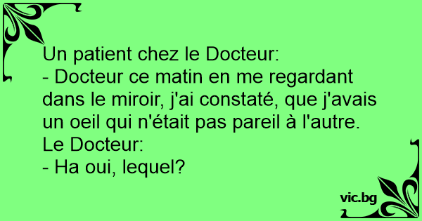 - Docteur ce matin en me regardant dans le miroir, j'ai constaté, que j'avais un oeil qui n'était pas pareil à l'autre.