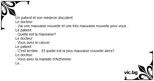 Un homme demande à son médecin : - Alors docteur, quel est votre diagnostic ? - Désolé, monsieur, mais je dois vous annoncer une mauvaise et une très mauvaise nouvelle. La très mauvaise, c'est que...