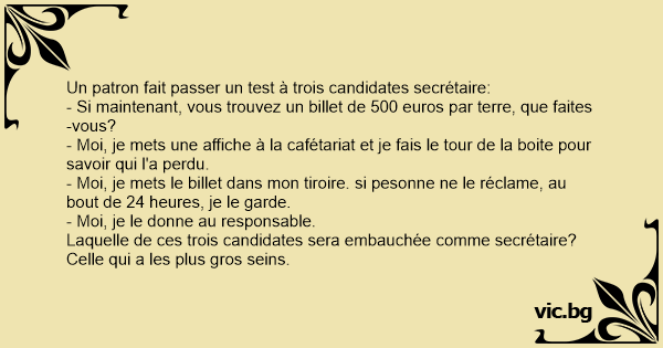 - C'est l'histoire d'un patron qui, pour recruter sa secrétaire décide de poser la même question à 3 candidates : - "Que faites vous si vous trouvez un billet de 500 F par terre ?" La première dit...