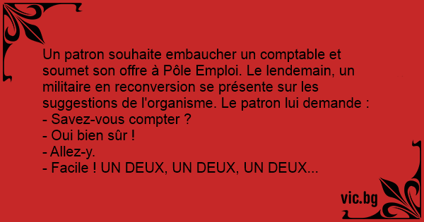 Un patron souhaite embaucher un comptable et soumet son offre à Pôle Emploi. Le lendemain, un militaire en reconversion se présente sur les suggestions de l'organisme. Le patron lui demande :