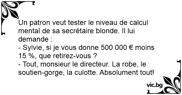 Un patron veut tester le niveau de calcul mental de sa secrétaire blonde. Il lui demande :