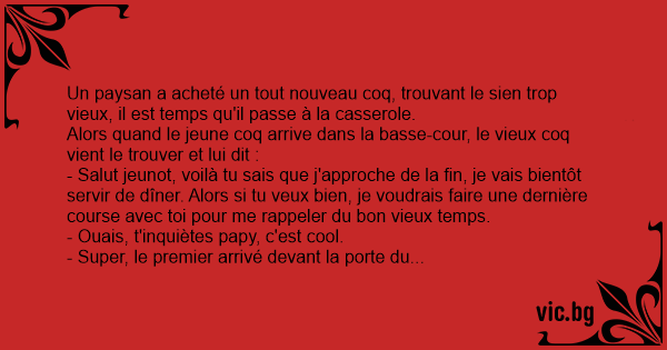 Alors quand le jeune coq arrive dans la basse-cour, le vieux coq vient le trouver et lui dit :