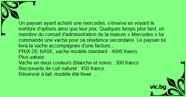 Un paysan ayant acheté une mercedes, s'énerva en voyant le nombre d'options ainsi que leur prix. Quelques temps plus таrd, un membre du conseil d'administration de la maison « Mercedes » lui commande une vache pour sa résidence secondaire. Le paysan lui livra la vache accompagnée d'une facture…