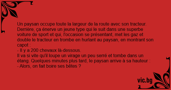 Un paysan occupe toute la largeur de la route avec son tracteur. Derrière, ça énerve un jeune type qui le suit dans une superbe voiture de sport et qui, l'occasion se présentant, met les gaz et double le tracteur en trombe en hurlant au paysan, en montrant son capot :